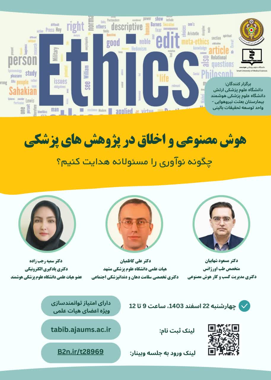 دانشگاه علوم پزشکی هوشمند وبینار "هوش مصنوعی و اخلاق در پژوهش های پزشکی؛ چگونه نوآوری را مسئولانه هدایت کنیم؟"